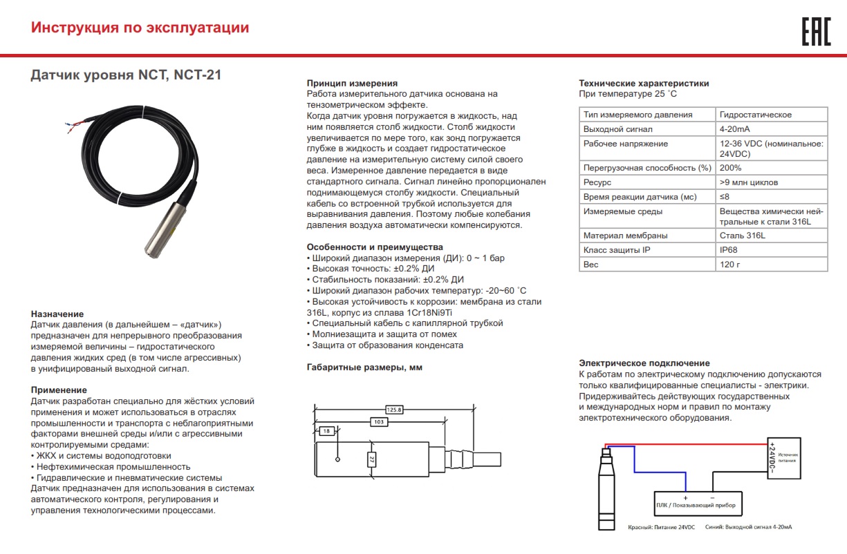 Погружной датчик уровня предназначен для непрерывного преобразования измеряемой величины – гидростатического давления жидких сред (в том числе агрессивных) в унифицированный выходной сигнал. Датчик разработан специально для жестких условий применения и может использоваться в отраслях промышленности и транспорта с неблагоприятными факторами внешней среды и/или с агрессивными контролируемыми средами: