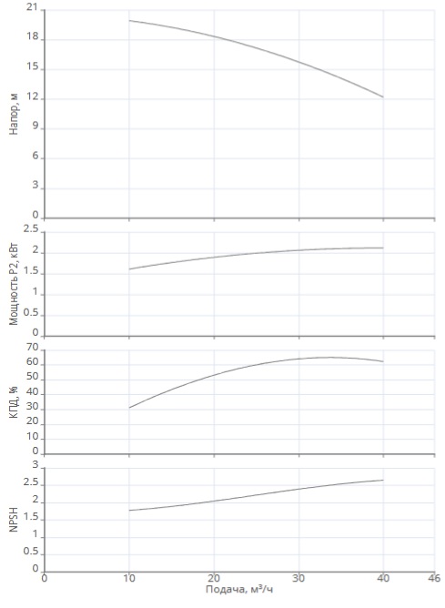 Ин-лайн исполнение с низким уровнем шума и вибрации с промежуточным корпусом и неподвижно присоединенным унифицированным (стандартным) электродвигателем. С независящим от направления вращения скользящим торцевым уплотнением в кожухе с принудительным охлаждением и снижающим кавитацию рабочим колесом. Фланцы по EN1092-2 со штуцерами R 1/4” для возможности измерения давления. Все чугунные компоненты снаружи и внутри имеют защитное катафорезное покрытие. Электродвигатель класса IE2.