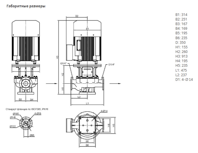 Ин-лайн исполнение с низким уровнем шума и вибрации с промежуточным корпусом и неподвижно присоединенным унифицированным (стандартным) электродвигателем. С независящим от направления вращения скользящим торцевым уплотнением в кожухе с принудительным охлаждением и снижающим кавитацию рабочим колесом. Фланцы по EN1092-2 со штуцерами R 1/4” для возможности измерения давления. Все чугунные компоненты снаружи и внутри имеют защитное катафорезное покрытие. Электродвигатель класса IE2.