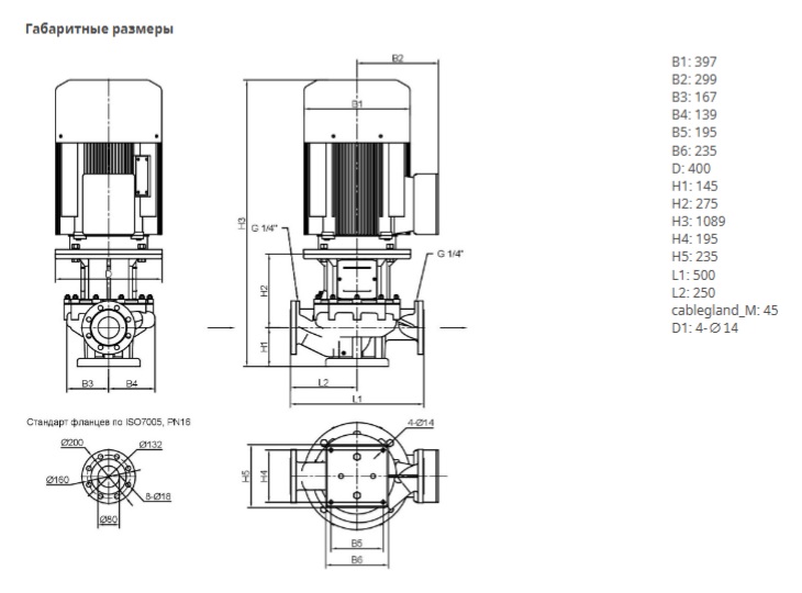Ин-лайн исполнение с низким уровнем шума и вибрации с промежуточным корпусом и неподвижно присоединенным унифицированным (стандартным) электродвигателем. С независящим от направления вращения скользящим торцевым уплотнением в кожухе с принудительным охлаждением и снижающим кавитацию рабочим колесом. Фланцы по EN1092-2 со штуцерами R 1/4” для возможности измерения давления. Все чугунные компоненты снаружи и внутри имеют защитное катафорезное покрытие. Электродвигатель класса IE2.