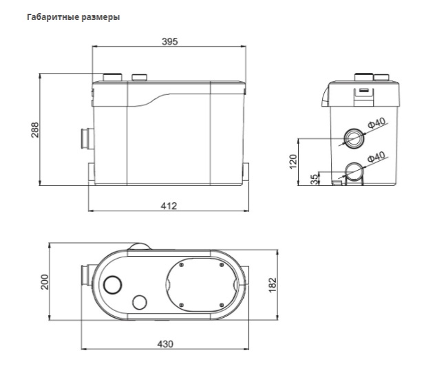 - Приточные патрубки: 1×100 мм и 3×40 мм для моделей с режущим механизмом, 3×40 мм для моделей без режущего механизма