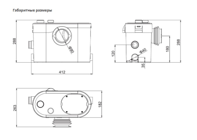 • Приточные патрубки: 1×100 мм и 3×40 мм для моделей с режущим механизмом, 3×40 мм для моделей без режущего механизма