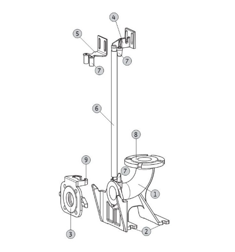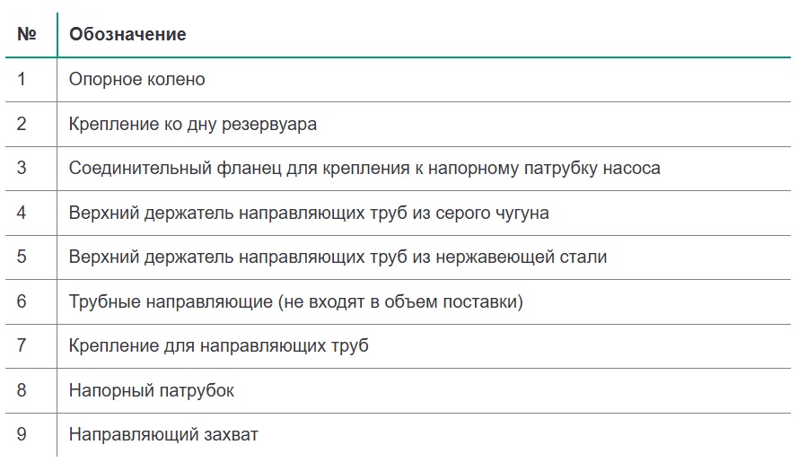 Опорное колено является центральным компонентом. Оно устанавливается непосредственно в рабочей зоне и служит для присоединения к напорному трубопроводу и для крепления насоса. Соединительный фланец с направляющими захватами обеспечивает движение насоса по направляющим трубам и присоединение к опорному колену. Соединение между данным фланцем и опорным коленом выполняется автоматически под действием веса самого насоса. Герметичность соединения обеспечивается уплотнительным кольцом, уложенным в соединительный фланец. Во время работы насоса уплотнительное кольцо потоком воды прижимается к опорному колену для исключения утечек.